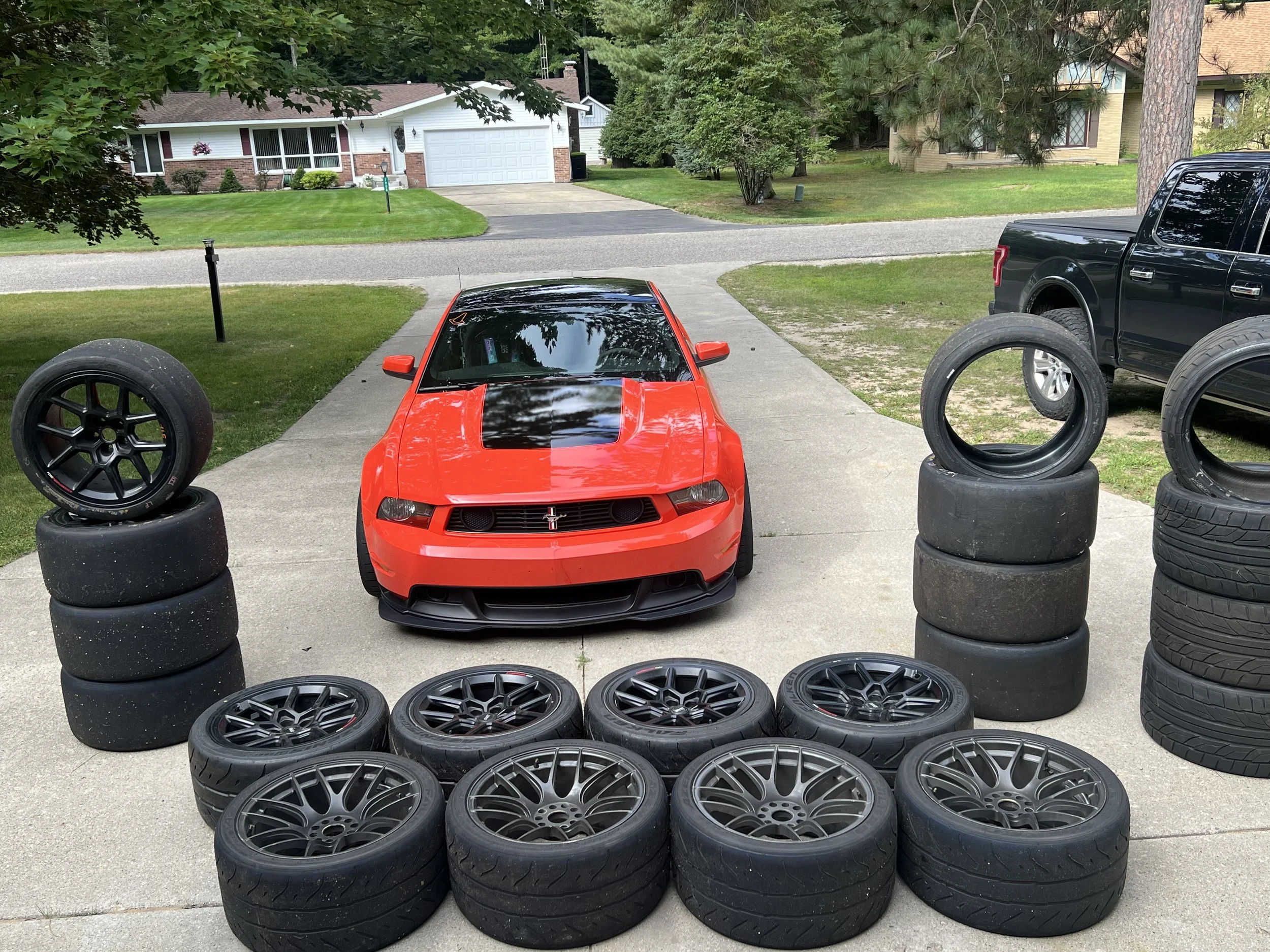 Wheels & Brakes: I have four sets of wheel setups that get rotated depending on the type of driving. All four sets are 19x11. This is achieved by using ARP extended lug studs and different spacers for the varying offsets of the rims. Two sets are from Ford Racing, one from LMR, and one economical set from XXR. I have Falken RT660s, Bridgestone RE71RS, and Nitto NT555 G2s, all in 305/30/19 for autocross and street driving. I also have one set mounted with 295/30/19 Michelin slicks for HPDE days. The front brakes are 6-piston Brembo fixed calipers from a 2015 Ford Mustang, paired with 2013 GT500 factory rotors and EBC Blue Stuff pads for a linear braking feel. Stainless steel brake lines are installed at all four corners with Castrol SRF brake fluid. The rear setup consists of the stock calipers with EBC Blue Stuff pads and factory rotors.